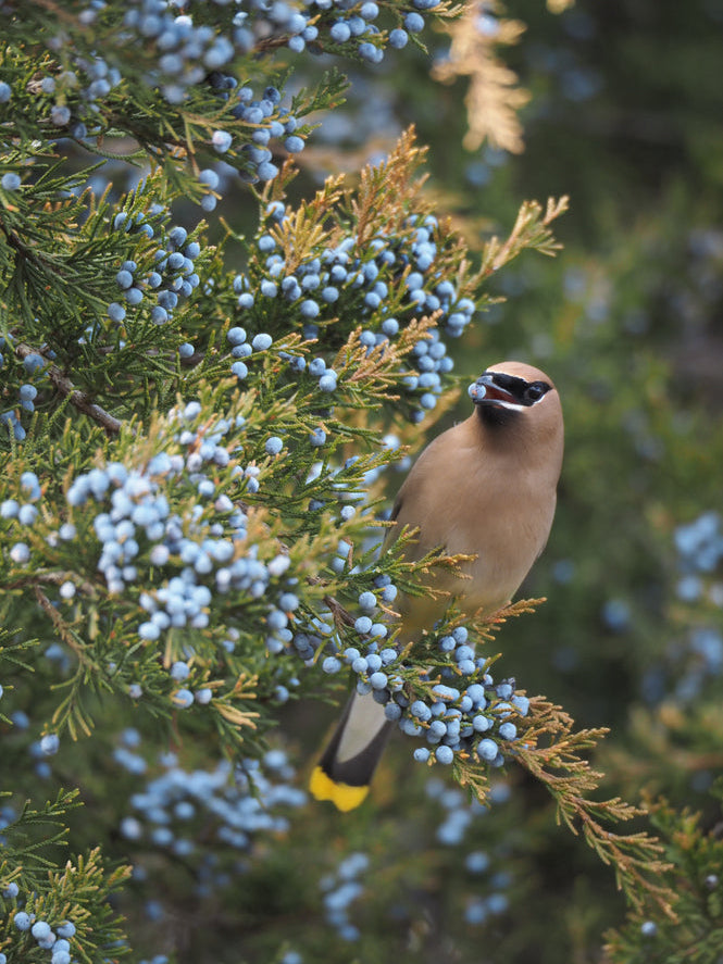 Eastern red cedar blooms in late winter to early spring, typically from February through April. It is a dioecious species, meaning individual trees are either male or female. Male trees produce small pollen cones, while female trees bear tiny green cones that mature into berry-like, bluish seed cones by late summer or early fall. These fleshy cones, take about a year to ripen and can persist through the winter, providing an important cold-season food source for wildlife. Birds, particularly cedar waxwings, consume the fruits and disperse the seeds, helping to spread the species across the landscape.